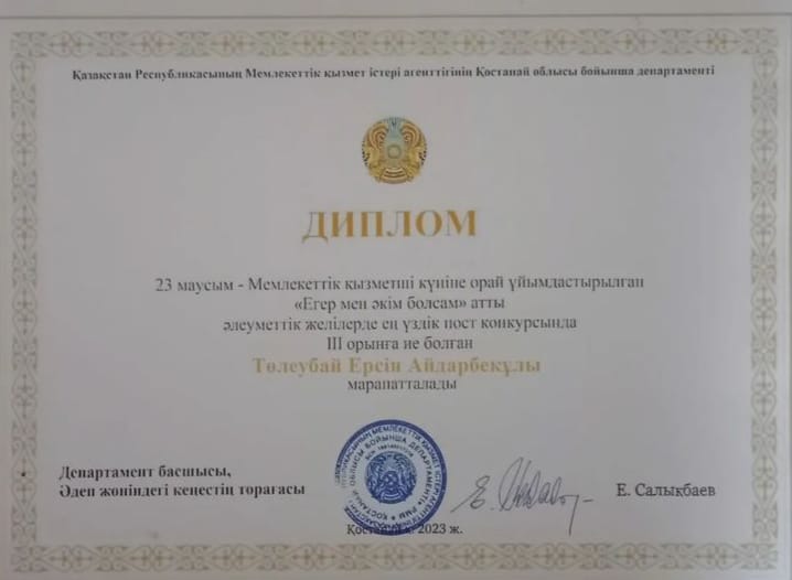 "Егер де мен әкім болсам" атты аталған байқауда 3' орынға ие болған