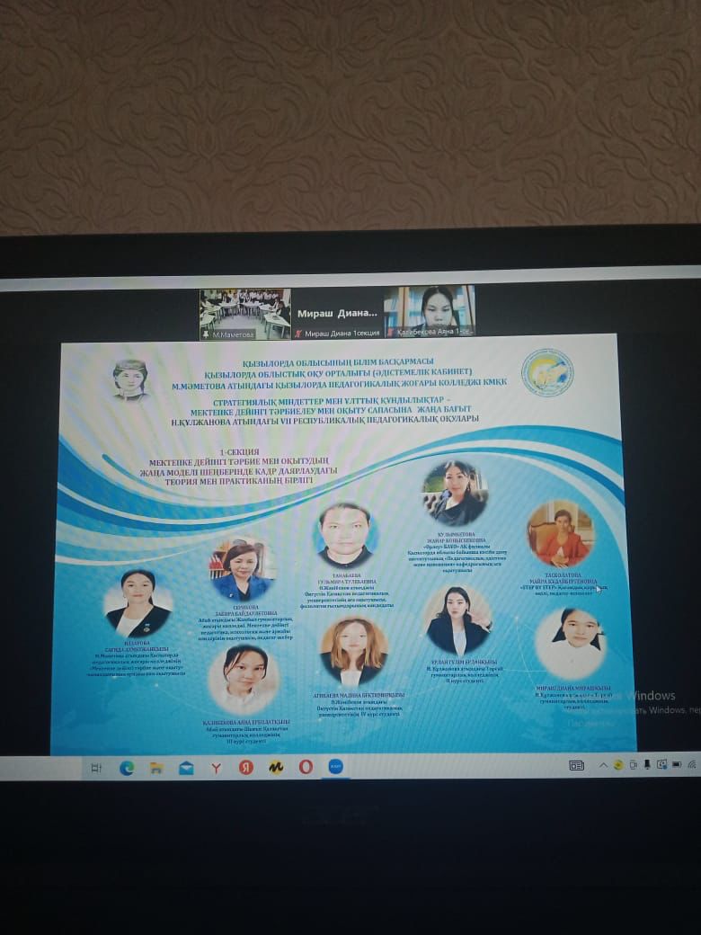 Аубакирова Толқын Утешовна, МД-22 тобының студенті Дүйсекова Аружан Темірханқызы «Цифрлық кезеңдегі отбасы тәрбиесі: заманауи тәсілдер және ұлттық бірегейлікті сақтау» тақырыбында; Ақылбекова Луиза Бекетовна, БМ-42 тобының студенті Есқали Гүлімжан Рауанқызы «Мектеп жасына дейінгі балалардың дамуына ықпал ететін трансформациялық ойындар» тақырыбында; Хасенова Зайгул Рашитовна МД-31 тобының студенті Диана Мирашқызы «Ұлт болашағы-ұрпақ тәрбиесі» тақырыбында; Білісбекова Динара Білісбековна ЖД-21 тобының студенті Қарсақбай Камила «Заманауи білім беруде интер белсенді әдіс-тәсілдерді қолдану жолдары» тақырыбында баяндамаларын қашықтан, онлайн форматта қорғады. Барлық қатысушылар мен жетекшілер алғыс хаттар мен сертификаттарға ие болды. Н. Құлжанова есімінің ұлықталған іс шараға қатысу біздің колледжіміздің басты парызымыз деп блеміз. Қызылордалық әріптестерімізге көп рақмет.