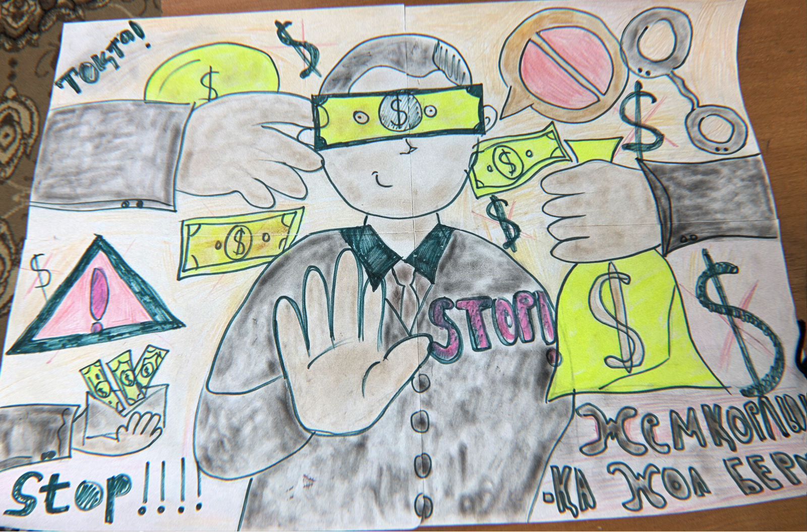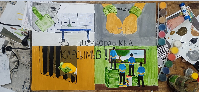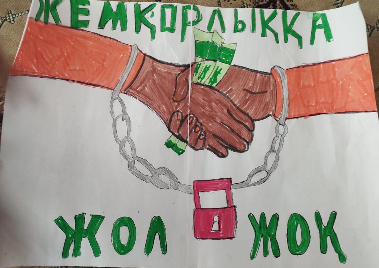"Біз жемқорлыққа қарсымыз" атты туындысын сондай ақ, МД - 32 тобының студенті Ерлан Гүлім Ерланқызы, МД - 31 тобының Құсаинова Жансая Айдарханқызы жемқорлыққа қарсылықтары бейнеленген суреттерін көрмеге ұсынды.Жастар жемқорлықсыз қоғамды таңдайды.