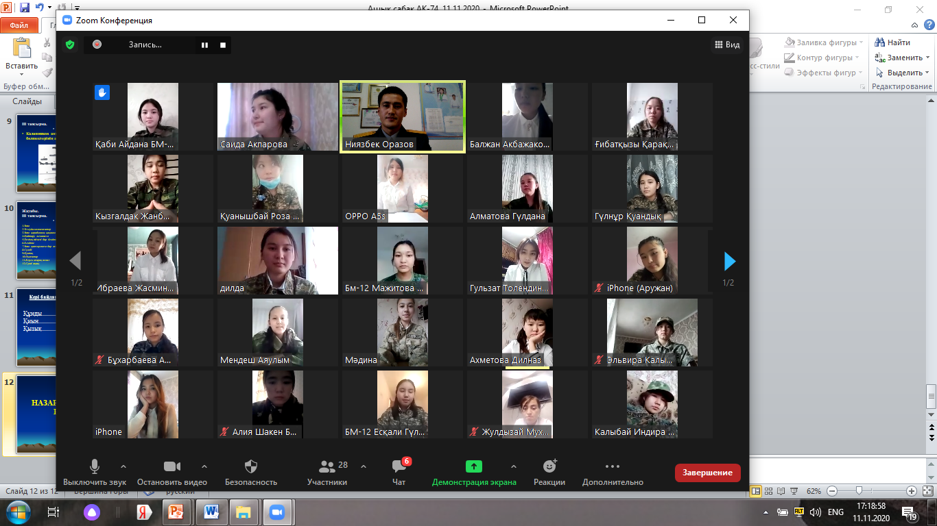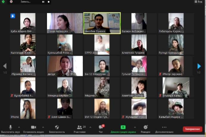 Қараша айының 11.11.2020 ж. «Гуманитарлық пәндер» ПЦК бірлестігінің он күндігі аясында Алғашқы әскери дайындық пәнінің оқытушысы: «Лейтенант» Оразов Ниязбек Рамазанұлының «Автоматты (пулеметті) бөлшектеу және жинақтау» тақырыбында БМ-12 тобына «Zoom» платформасы арқылы ашық сабақ өткізілді. Білі алушыларға Калашников автоматын жартылай бөлшектеу және жинақтау ретімен толықтай таныстырып өтті. Калашников автоматының (АК-74) бөлшектерінің атауларын білімалушыларға толықтай түсіндіріп, жан-жақты қарастырылып, талқыланып, өткізілді. АК-74 автоматының қауіпсіздік ережелеріне тоқталып кетті.