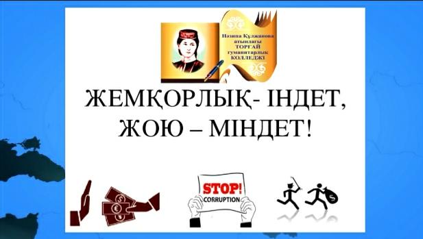 Осындай шаралардың бірі «Жемқорлыққа жол жоқ!» тақырыбында бейнебайқау сайысы. Шараның негізгі мақсаты қоғамда құқықтық сауаттылықты көтеру және балаларға жемқорлықтың салдарымен түсіндіру болып табылады. Іс - шара барысында облыс бойынша жиырма жеті колледж қатынасып, нәтижесінде Арқалық қаласынан Нәзипа Құлжанова атындағы Торғай гуманитарлық колледжі жеңіс тұғырынан көрініп, жүлделі 2 – орынға ие болды. «100 нақты қадам» Ұлт жоспарының 13 - қадамында да жемқорлыққа қарсы күресті күшейту мәселелері нақты көрсетілген. Мұның барлығы сыбайлас жемқорлыққа қарсы күресте нақты нәтижелерге қол жеткізуге мүмкіндік береді деп ойлаймын. Сондықтан, сыбайлас жемқорлыққа қоғам болып қарсы тұруымыз қажет, бұқара көпшілік тарапынан сыбайлас жемқорлық көріністеріне қолдан келгенше тосқауыл қойылып, қолында билігі бар азаматтар осы жолда өзгелерге үлгі болуы тиіс.