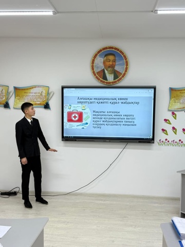 Әдіскер Каппасова Шамшырак Еркиновна білім алушыларға алғашқы медициналық көмек көрсетудің әдіс-тәсілдерін, көмек көрсетудегі құрал-жабдықтар, соғып алу және буынның тартылуы, жаралар, мұрыннан қан кету, сүйектің сыну және шығу кезіндегі алғашқы көмек, бас жарақаты кезіндегі, қан кетудегі, көздің жарақаттануы, төтенше жағдайлар кезіндегі алғашқы көмектерді теориялық және тәжірибелік түрде көрсетіп, оқу тәжірибе кезінде білім алушылар бір-біріне тәжірибе жасап үйреніп, соңғы күні оқу тәжірибелерін қорғады.