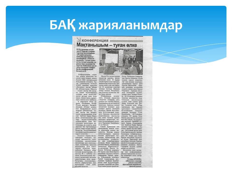 16 слайд БАҚ жарияланымдар: Облыстық «Қостанай таңы»,«Учительская плюс», қалалық «Арқалық хабары», «Торғай» газеттерінде мақалалар жіберілді.
